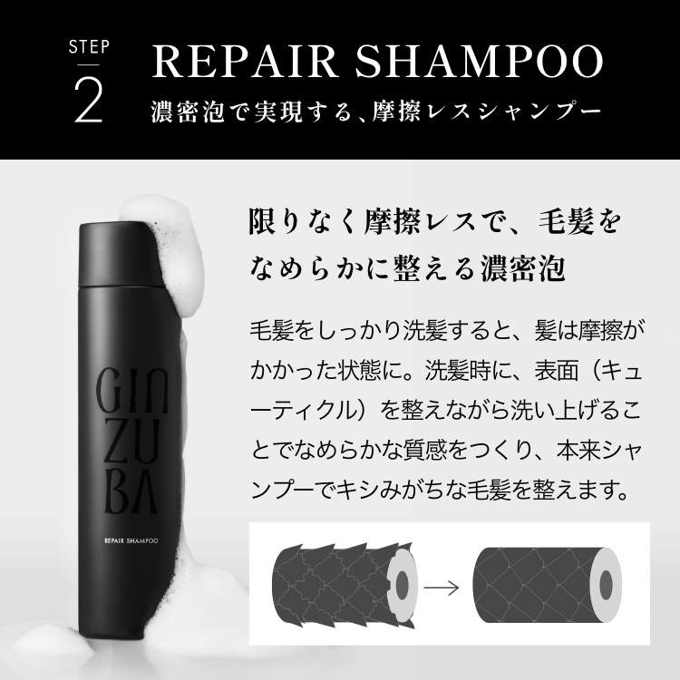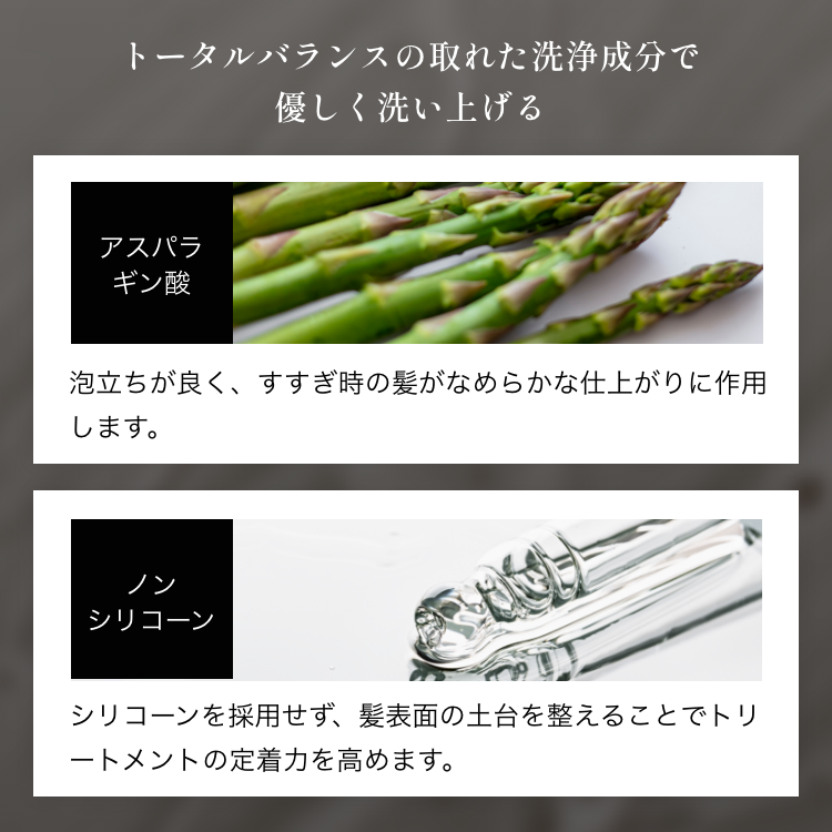 毛髪をしっかり洗髪すると、髪は最も摩擦がかかった状態となります。洗髪時に、表面(キューティクル)を整えながら洗い上げることでなめらかな質感をつくり、キシみがちな毛髪を整えます。