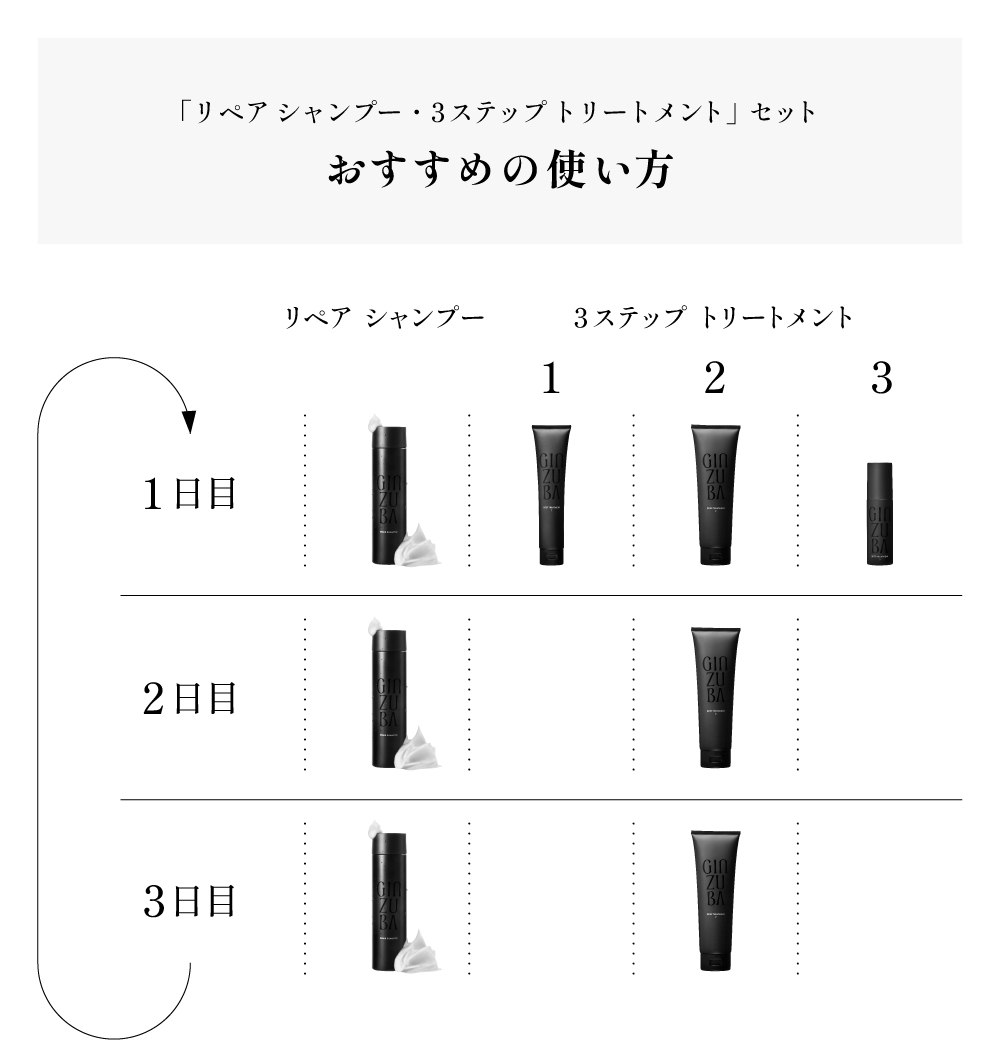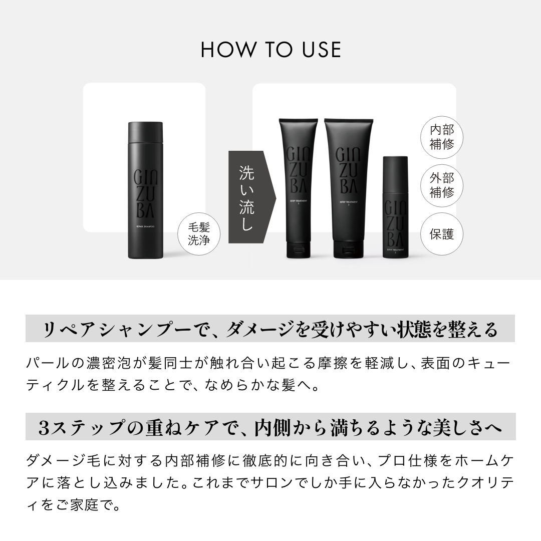 シャンプー後、水気を切りSTEP1 トリートメント ジェルを"毛先中心"になじませます。すすがずに、STEP2 トリートメント マスクを"根本以外の髪全体"によくなじませて3~5分おきます。すすがずに、STEP3 トリートメント オイルを"毛先"中心になじませます。充分に洗い流してください。