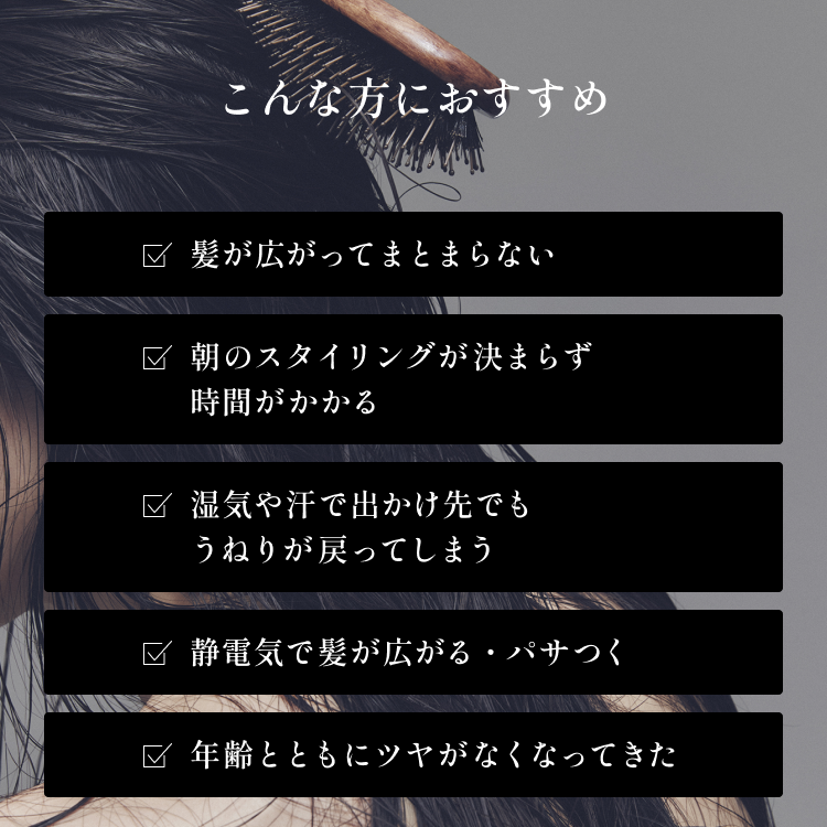 髪の内側からしっかり潤い、乾燥やうねりによる広がりをおさえて、まとまりのある髪へ。