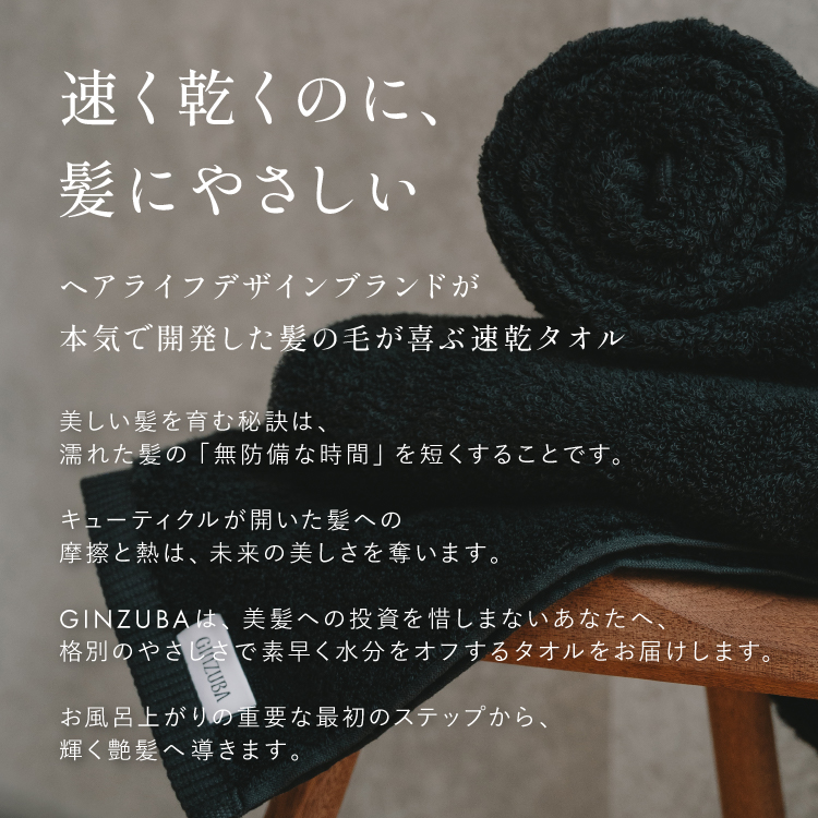 高吸水設計により、髪をゴシゴシ擦る必要はなく、タオルを優しく当てるだけで水分をしっかり吸収。髪や頭皮への摩擦を抑えることで、デリケートなキューティクルを守ります。