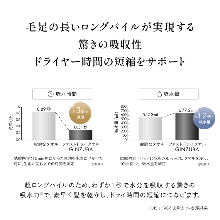 超ロングパイルのため、わずか1秒で水分を吸収する抜群の吸水力※で、素早く髪を乾かし、髪への負担が軽減されます。